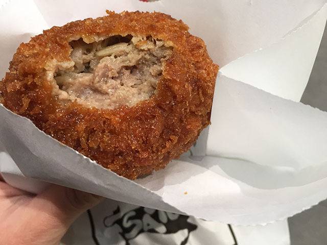 선로드 상점가 안에는 즉석에서 튀겨낸 따끈따끈한 멘치카츠(다진 고기를 공모양으로 튀긴 커틀릿)가 맛있는 사토우(SATOU) 맛집이 있습니다.