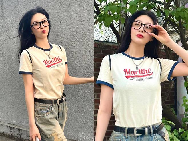2000년대 초반 유행한 패션인 'Y2K 패션'을 선보인 조이는 통이 넓은 청바지에 목과 팔 라인에 밴딩이 들어간 캐주얼한 티셔츠를 매치했다.