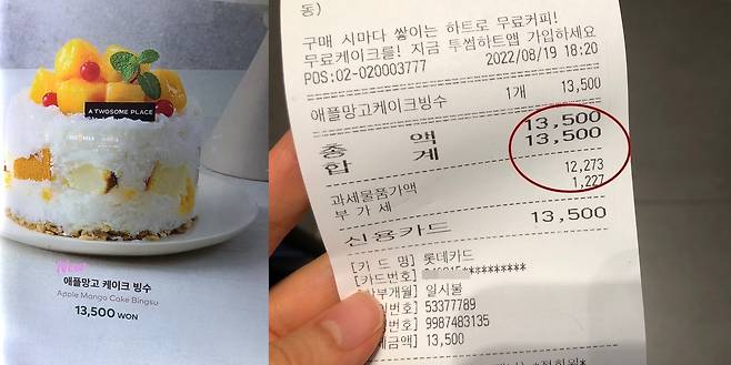 한참을 고민하다 애플망고 케이크 빙수로 결정. 가격은 13,500원 입니다.