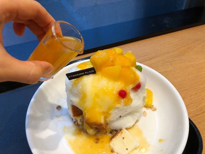 빙수는 이렇게 망고시럽도 함께 제공됩니다. 시럽을 부워서 애플망고를 한 입~~