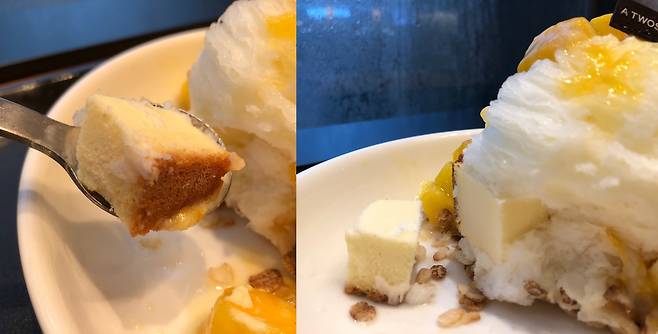 바로 이 빙수입니다. 빙수 위에 케이크를 올린 메뉴에요.