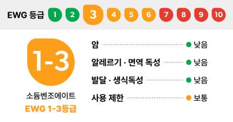물론 직접 흡입하거나 비타민C성분과 배합하는 경우는 드물겠지만, 비타민C가 포함된 화장품을 사용하거나, 레몬, 오렌지, 라임 추출물에 함유되어 있는 비타민C와 만난다거나 하여 벤젠이 생성될 가능성이 있기 때문에 EWG등급에서 1~3등급 판정을 받았습니다.