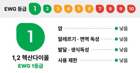 1,2-헥산다이올(1,2-헥산디올)은 보통 1~3%를 첨가하는데, 2%는 6개월 정도, 3%가 첨가되면 약 1년까지 보존가능합니다. 또한, EWG등급도 1등급으로 안전한 것이 입증된 성분입니다.