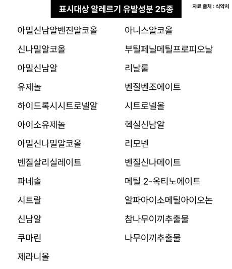 보통 향을 첨가해주는 착향제에 대해 알레르기가 많이 발생하는데, 알레르기가 유발되지 않는다면 '향료'로 기재할 수 있지만, 화장품법 시행규칙에 의거한 위 25종에 해당된다면 반드시 해당 성분명을 기재 및 표기해야합니다.