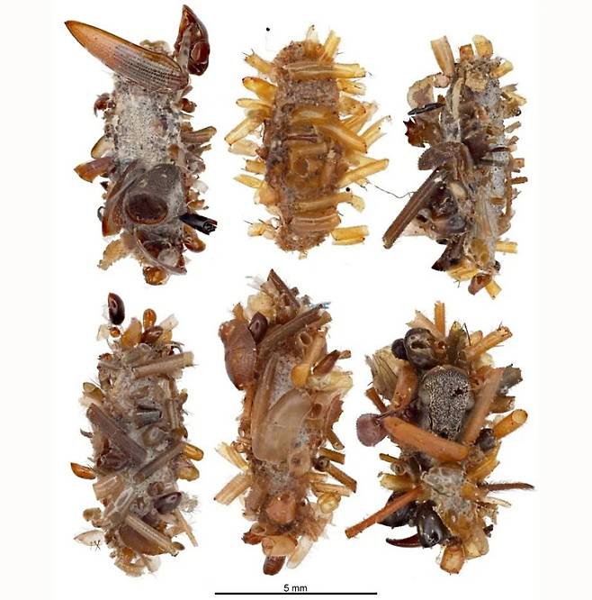 해당 애벌레는 히포스모코마(Hyposmocoma)속 나방 일부 종의 유충이다. 이 애벌레는 파리의 날개나 딱정벌레의 복부, 개미나 바구미의 머리 등 포식 과정에서 남은 부산물을 몸에 덕지덕지 붙인다.