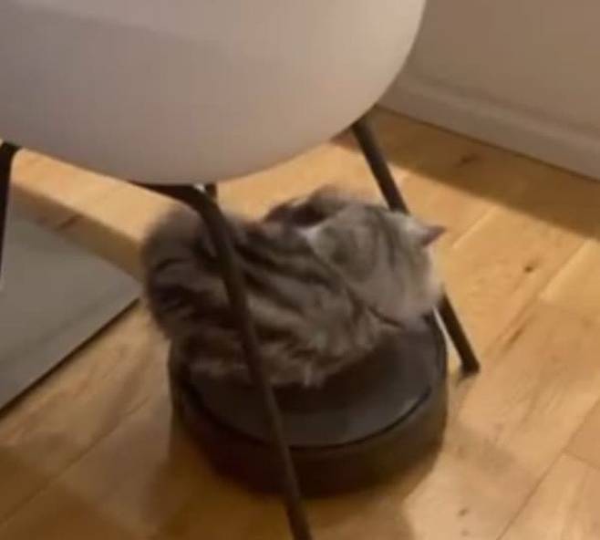 공개된 영상에 따르면 고양이는 무슨 영문인지 로봇 청소기 위에 떡하니 올라가서 자리잡고 앉아 있었죠.