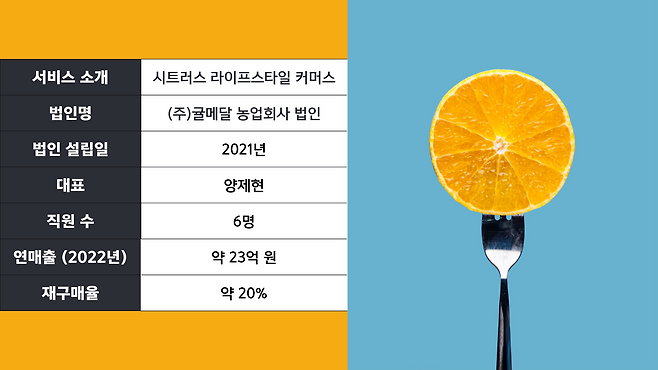 이 과정을 실행에 옮긴 분이 계세요. 제주도에서는 흔하디 흔한 과일, '귤'을 새로운 시각으로 접근해 상큼하고 위트 있는 '귤메달'이라는 브랜드를 만들어 황금향, 레드향을 비롯한 15종의 시트러스는 물론 달콤한 착즙주스로 만든 양제현 대표의 이야기입니다. 서울에서 직장인으로 일하다가 고향인 제주도에 귀향하여 2년 만에 연 매출 23억 원의 브랜드, '귤메달'의 스토리를 지금부터 즐겨보세요.
