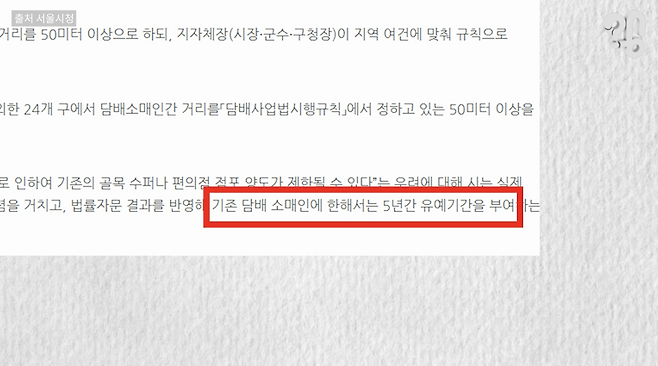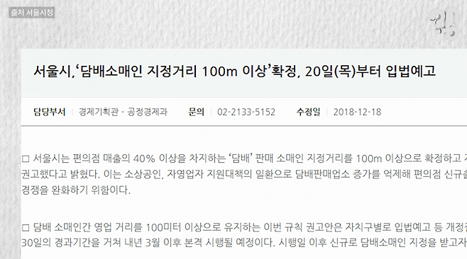 “이제 좀 생겨나는 것 같아요. 기준이 50m에서 100m로 바뀌다 보니까 이제 50m일 때의 점주님이 그만두시게 되면 바뀐 규정에서 다시 (담배권을) 딸 수가 없는 상황이 발생을 하는 거죠. 그래서 담배 못 파는 편의점들이 조금 느는 경우도 있는 것 같아요.”
