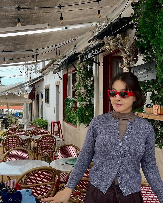 'La Contessa' 카페에서 박지영은 클래식한 레트로 무드의 패션을 선보이고 있다. 그레이 가디건과 브라운 터틀넥의 조합이 가을 분위기를 물씬 풍기며, 레드 선글라스로 화사한 포인트를 주었다. 파리지앵 감성이 느껴지는 이 앙상블은 유럽 카페의 분위기와 완벽하게 어우러져 영화 속 한 장면을 연상케 한다. 클래식한 아이템들을 현대적으로 재해석한 그녀의 스타일링 능력이 돋보이는 룩이다.