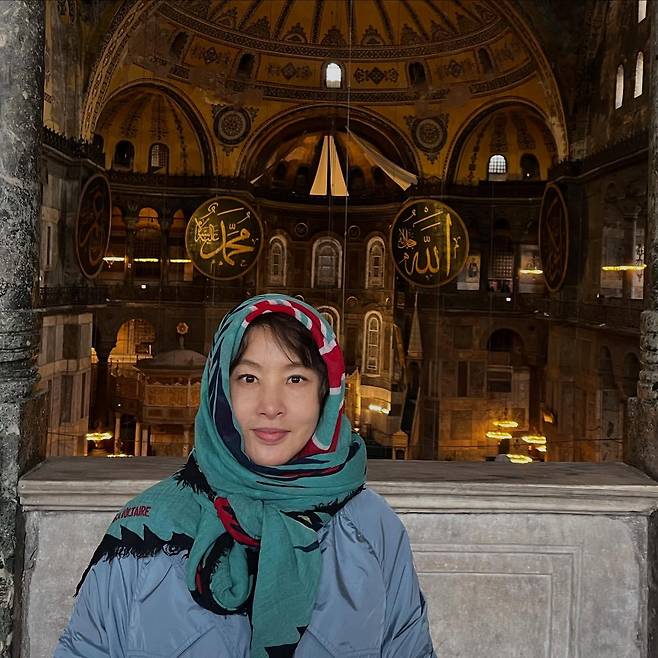 박지영이 이스탄불의 아야소피아 성당에서 선보인 패션이 눈길을 끈다. 청록색 바탕에 붉은색 패턴이 돋보이는 히잡을 우아하게 두른 그녀는 하늘색 점퍼와 함께 조화로운 컬러 매치를 연출하고 있다. 이슬람 문화권 방문 시 필요한 복장 예절을 지키면서도 자신만의 스타일을 잃지 않은 센스가 돋보인다. 특히 히잡의 화려한 패턴이 고대 건축물의 웅장함과 어우러져 이국적인 분위기를 한층 더 강조하고 있다.