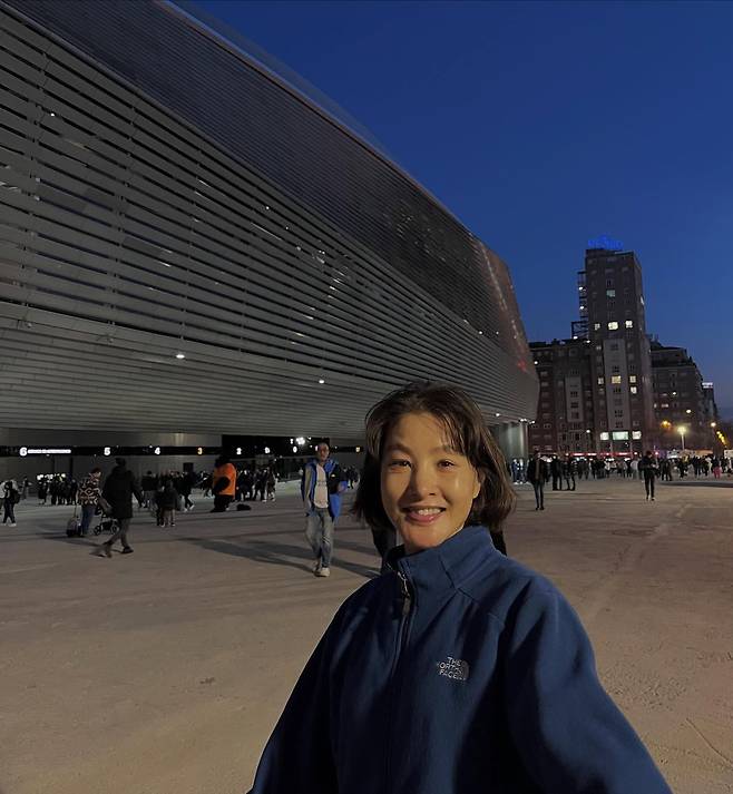 현대적인 건축물 앞에서 박지영은 스포티한 아웃도어 패션을 연출하고 있다. 더 노스페이스의 네이비 집업 재킷을 착용한 그녀는 밤 시간대의 도시 풍경과 어우러져 세련된 분위기를 자아낸다. 실용성과 스타일을 동시에 갖춘 이 룩은 도시 야간 관광에 최적화된 선택으로, 활동성을 중시하면서도 트렌디한 감각을 놓치지 않는 그녀의 패션 센스를 엿볼 수 있다.