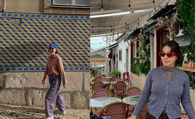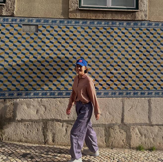 포르투갈 리스본의 아름다운 타일 벽화 앞에서 박지영은 편안하면서도 세련된 캐주얼 룩을 선보이고 있다. 연분홍색 셔츠에 여유로운 그레이 와이드 팬츠를 매치하고 파란색 캡 모자로 포인트를 주었다. 도시의 화려한 타일 패턴과 대비되는 심플한 의상 선택이 오히려 그녀의 자연스러운 매력을 돋보이게 한다. 유럽 여행객들이 선호하는 실용적이면서도 스타일리시한 여행 패션의 좋은 예시를 보여주고 있다.