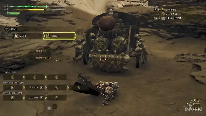 해머에는 새로운 차지 요소가 추가됐습니다. 어퍼컷, 회전강어퍼컷, 모으기 3차지, 내려치기 4번째에서 파생되는 혼신 모으기입니다. R+좌클+우클로 혼신 모으기를 발동할 수 있습니다. 혼신 모으기 중에는 계속해서 해머를 돌리는데 이때 헌터의 몸이 빛날 때 해제하면 강력한 혼신 모아내려치기가 발동하게 됩니다. 반면, 헌터의 몸이 빛나지 않을 때는 상대적으로 약한 혼신 모아어퍼컷이 발동하니 타이밍을 잘 맞출 필요가 있습니다.