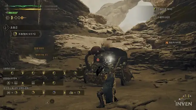 키마 기준으로 R+좌클을 누르고 있으면 벌레 모으기라고 해서 차지 상태가 되는데 이 상태에서 버튼을 해제하면 벌레가 날아가 최대 3연타를 하면서 진액을 모아옵니다. 부위만 잘 노리면 한 번에 3색 진액을 모두 모아올 수 있는 거죠.