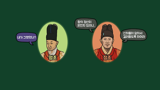 또한, 영조는 신하들에게 이치에 맞지 않는 명령을 내린 뒤 까먹기도 했습니다. 예를 들어 계획한 적이 없는 행사 소집 명령을 갑작스럽게 새벽 3~5시쯤 내려놓고, 명령에 따라 모인 신하들을 보며 소집한 사실을 기억하지 못하기도 했습니다.