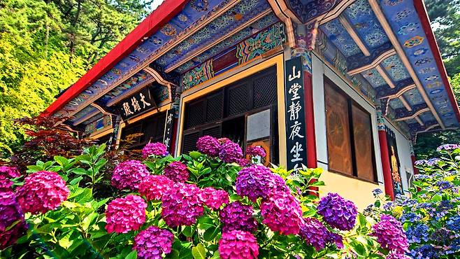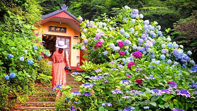 절에 도착하면 수국꽃이 경내를 빼곡히 둘러싸며 마치 동화 속 정원처럼 화려한 풍경을 선사한다. 수국은 색에 따라 꽃말도 각기 달라 분홍은 ‘진심’, 청색은 ‘냉정’, 흰색은 ‘변덕’을 의미한다. 걷는 것만으로도 자연과 감성이 어우러진 여행이 완성된다.