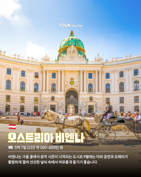 도시 곳곳이 동화같은 비엔나는 가을 클래식 음악 시즌이 시작되는 도시입니다. 9월에는 야외 공연과 오페라가 활발하게 열리며, 선선한 날씨 속에서 역사적인 궁전과 미술관을 여유롭게 즐기기 좋습니다.