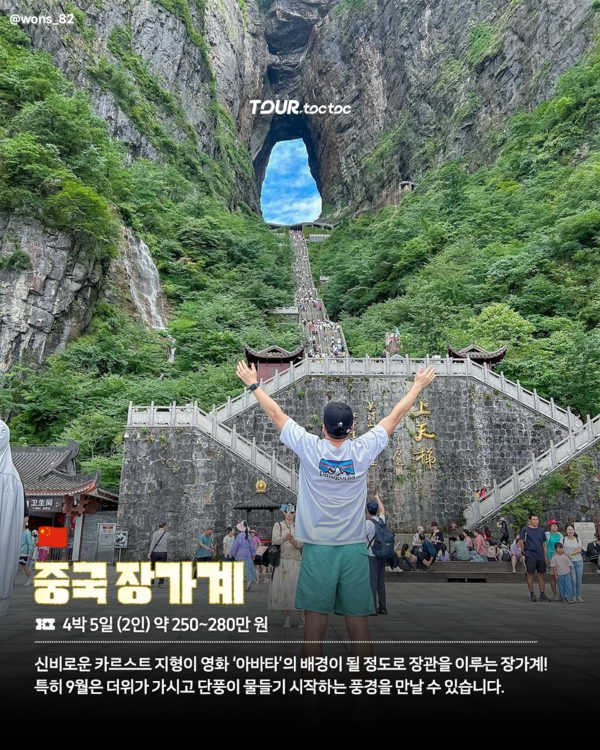 신비로운 카르스트 지형과 영화 ‘아바타’의 배경이 된 기암괴석이 장관을 이루는 장가계는 9월이 가장 좋은 계절입니다.