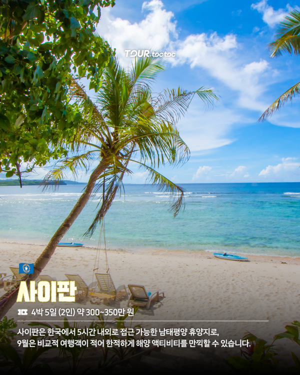사이판은 한국에서 5시간 내외로 접근 가능한 남태평양 휴양지로, 9월은 성수기를 피해 프라이빗하게 한적하게 여행을 즐기기 좋습니다. 청량한 바다에서 스노클링, 다이빙을 즐기며 여유로운 힐링을 만끽할 수 있어 9월 해외여행지로 추천드립니다.