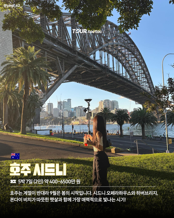 호주는 계절이 반대라 9월은 봄의 시작으로 선선해 여행을 즐기기 제격인 시기입니다. 또 시드니 오페라하우스와 하버브리지, 본다이 비치가 따뜻한 햇살과 함께 가장 매력적으로 빛나는 시기이죠.
