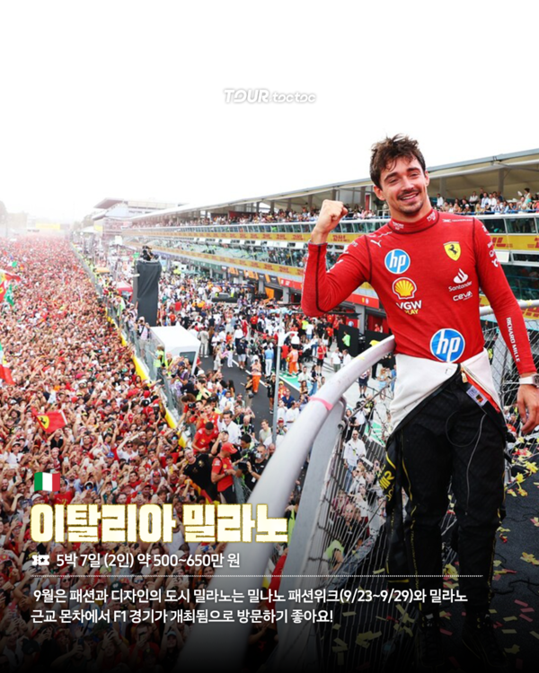 또 이 시기는 밀라노 패션위크(9/23~9/29)가 열리는 시기이기도 해서 전 세계 패션 피플들이 모여들며 밀라노 근교 몬차에서는 F1경기가 개최되어 다양한 즐길거리가 가득합니다.