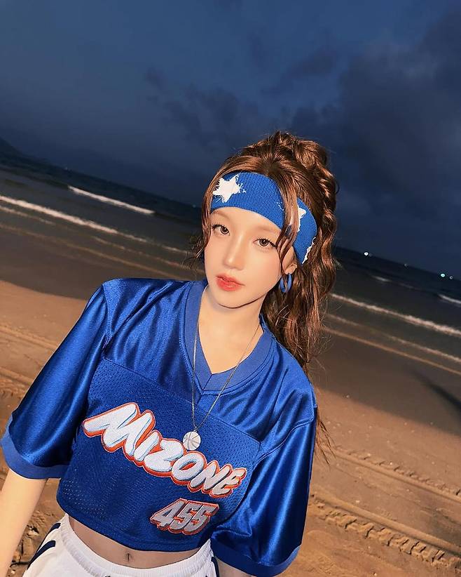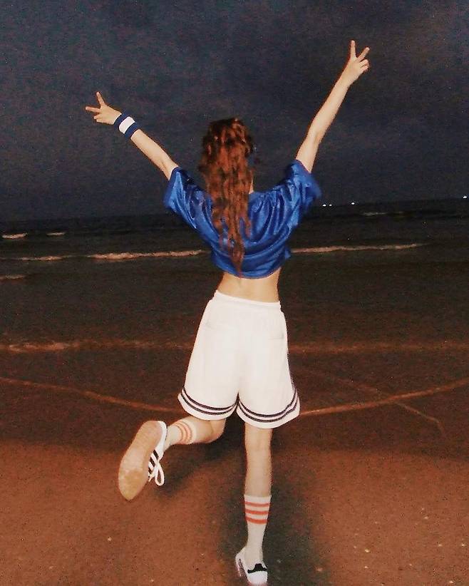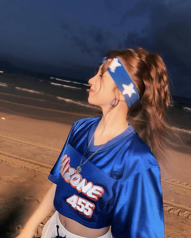 밤바다를 배경으로 한 사진 속 우기는 크롭 기장의 블루 저지 톱과 화이트 하프 팬츠를 매치해 경쾌하면서도 스포티한 무드를 완성했다. 바람결에 흩날리는 웨이브 헤어, 그리고 환하게 빛나는 피부톤이 어우러지며 장면 전체가 한 편의 뮤직비디오처럼 느껴진다.