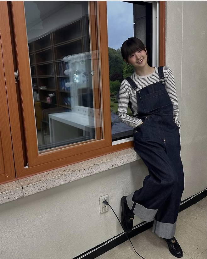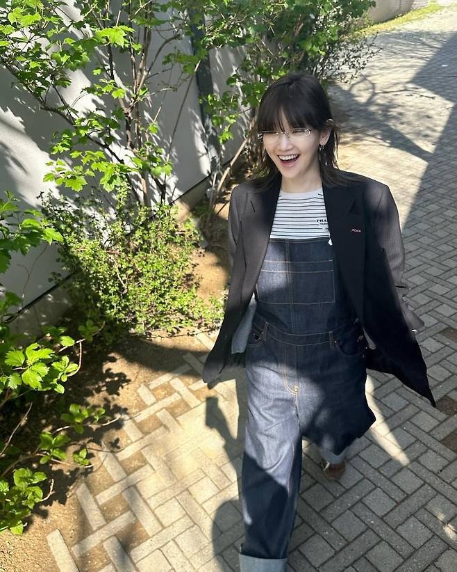 박소담은 스트라이프 티셔츠에 넉넉한 생지 데님 멜빵바지를 매치하고 블랙 테일러드 재킷으로 무심한 듯 시크한 분위기를 더했습니다.