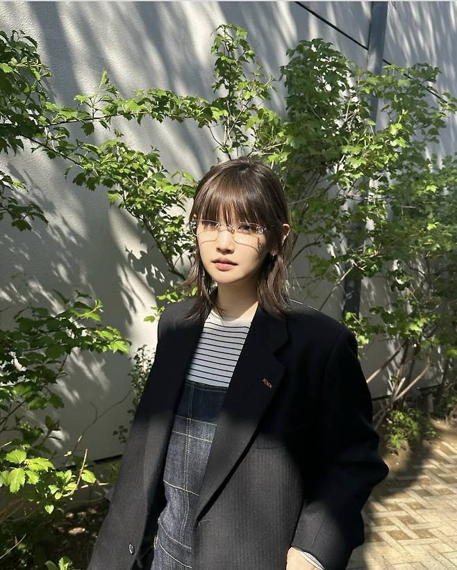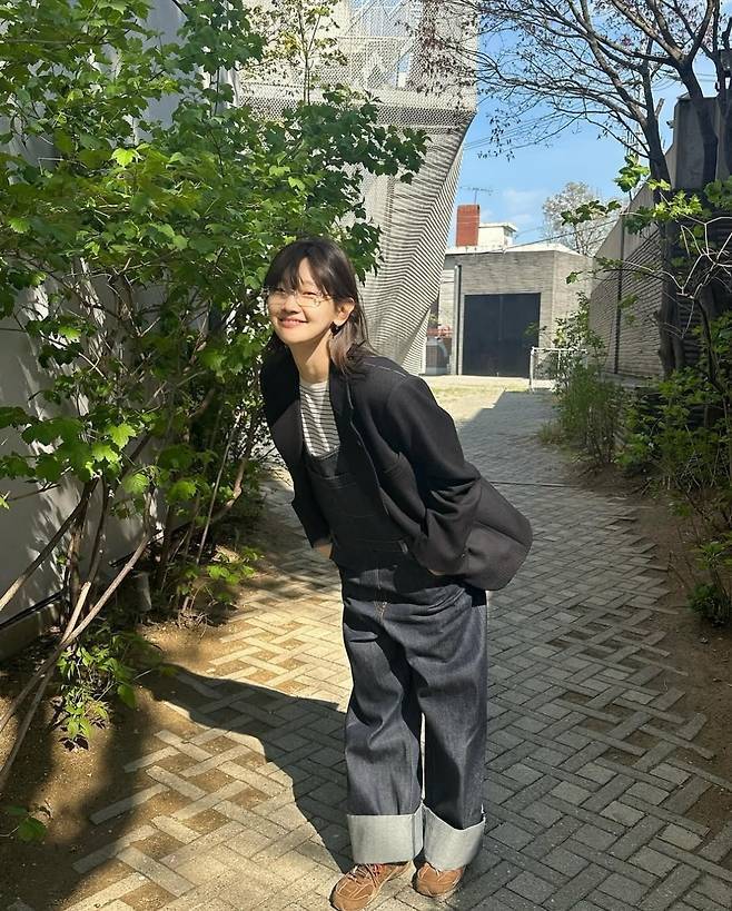 여기에 선명한 프레임의 안경과 캐주얼한 운동화, 그리고 햇살을 머금은 듯 자연스럽게 흩날리는 머릿결이 따뜻한 계절감까지 담아냈습니다.
