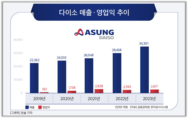 그렇게 계속 성장한 다이소는 작년 매출 3조 4604억 원, 영업이익 2617억 원으로 각각 17.5%, 9.4% 증가하며 3조 클럽에 입성했어. 이렇게 잘나가는 만큼 다이소는 현재 전국적으로 1520여 개의 매장을 가지고 있고, 총 임직원 수 역시 1만 2349여 명으로 증가했대. 안성, 부산, 용인에 물류센터를 운영 중인 다이소는 외형 확대를 위해 물류 투자를 늘려 다이소 최대 규모 허브센터를 세종시에 건립할 계획이라고 해.