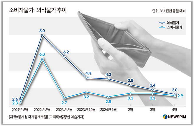 4월 소비자물가 상승률은 2.9%, 외식물가 승률은 3.0%였어. 3월에 비해 상승률이 둔화되었지만 통상 3%대는 고물가로 해석함에 따라 여전히 물가가 높다는 것을 알 수 있지. 고물가에 외식물가까지 상승하면서 사람들은 점점 소비를 줄이게 되고, 그에 따라 경기 침체가 우려되는 상황이야.