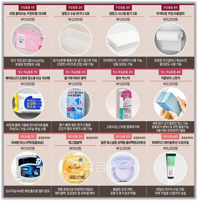 생활용품 잡화점으로 알려진 만큼 다이소에는 주방, 욕실, 수납 등 광범위한 생활용품과 문구용품, 식품 등 다양한 카테고리가 존재해👕⚒️. 최근에는 요즘 인기 있는 애견, 캠핑, 패션 등으로 카테고리를 더욱 확대해나가고 있어.