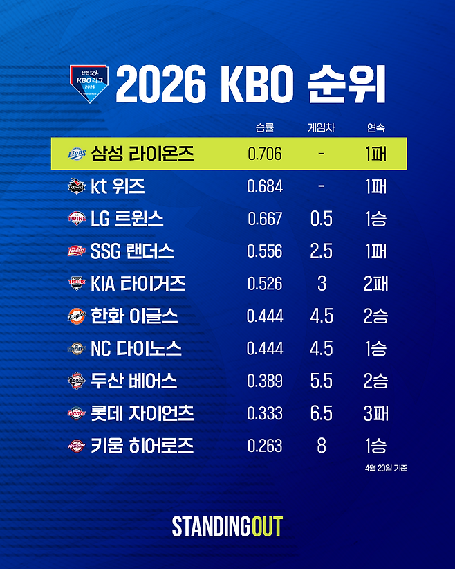[스탠딩아웃]= KBO 순위표가 다시 촘촘해졌다. 맨 앞은 삼성이다. 삼성은 12승 5패 1 무, 승률 0.706으로 선두에 올라섰다. kt가 13승 6패, 승률 0.684로 뒤를 잇고 있고, LG도 12승 6패, 승률 0.667로 0.5경기 차 추격을 이어가고 있다. 상위권만 놓고 보면 아직 누구도 안심할 수 없는 구도다.