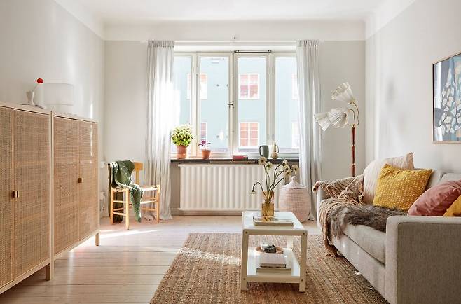 채광이 훌륭한 거실에는 라탄 수납장과 리넨 커튼, 감성적인 장스탠드가 더해져 따뜻한 분위기를 연출했다. 패브릭 소파와 소파테이블 위 꽃병이 공간에 생기를 더하며, 전체적으로 편안하고 코지한 감성을 자아낸다.