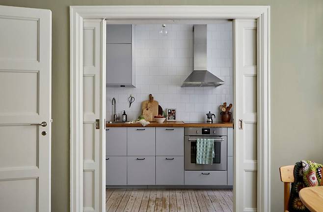 주방 공간을 중문으로 나누어 식사 공간과 요리 공간을 분리했다. 식탁 옆으로는 홈카페 공간이 마련돼 아늑한 휴식이 가능하며, 수납장과 테이블 조명으로 스타일과 기능을 동시에 잡았다. 소형 공간의 활용이 돋보인다.