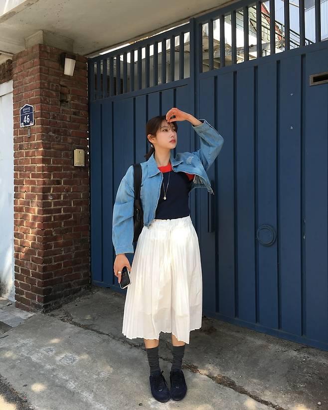 이너로는 네이비 톤의 티셔츠에 레드 컬러 포인트를 레이어드해 컬러 배색을 줬고,하의는 잔잔한 플리츠가 잡힌 아이보리 미디 스커트를 매치해 여성스러운 분위기를 더했어요.