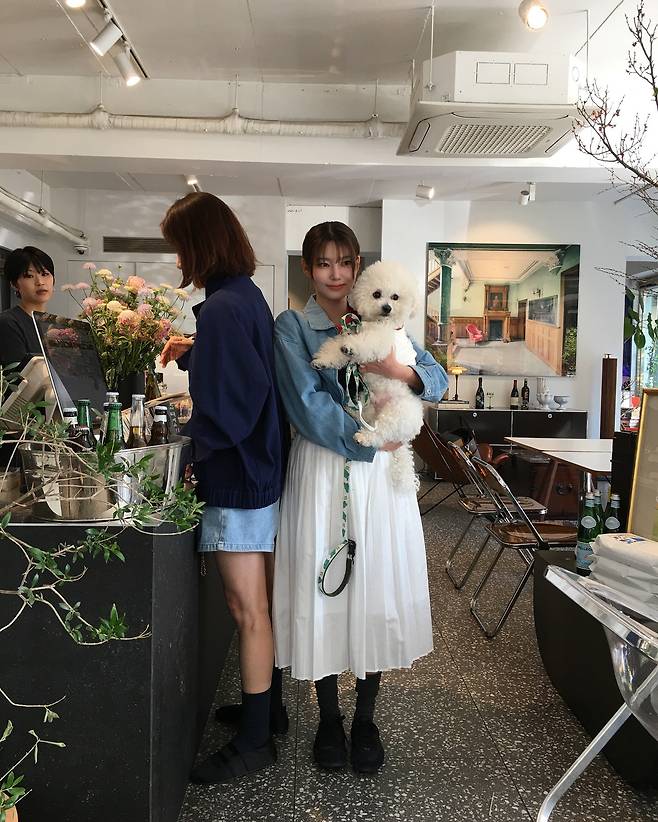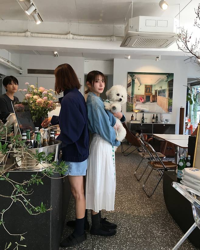 커피숍 안에서는 반려견을 품에 안고 있는 장면도 포착됐는데,데님과 화이트 스커트의 조합이 공간과도 조화롭게 어울려무심한 듯 편안한 하루의 기록처럼 느껴졌어요.