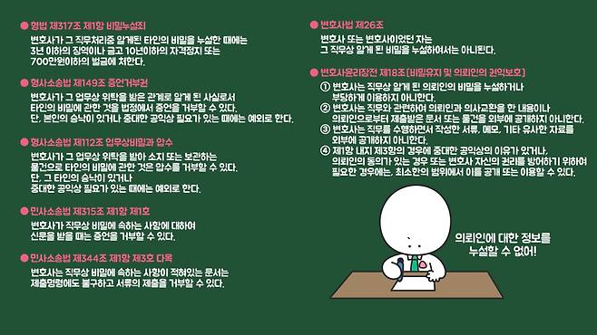 드라마나 영화와 같은 미디어를 통해 변호사에게는 의뢰인에 대한 비밀유지의무가 있다는 사실을 잘 알고 있을 겁니다.
