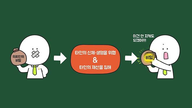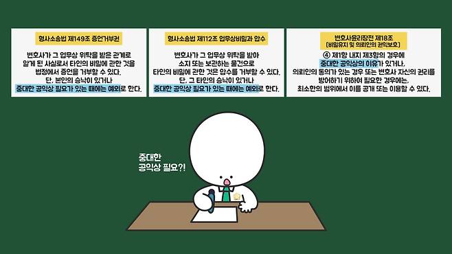 문제는 '중대한 공익상의 필요'가 정확히 무엇인지 법으로 규정하지 않았고, 논의만 있다는 겁니다. 일반적으로 변호사가 비밀유지의무를 지키는 것이 타인의 신체·생명을 위험하게 하거나 타인의 재산을 크게 침해하는 등의 범죄가 진행 또는 예정되는 상황에서는 지키지 않아도 된다고 알려졌습니다.