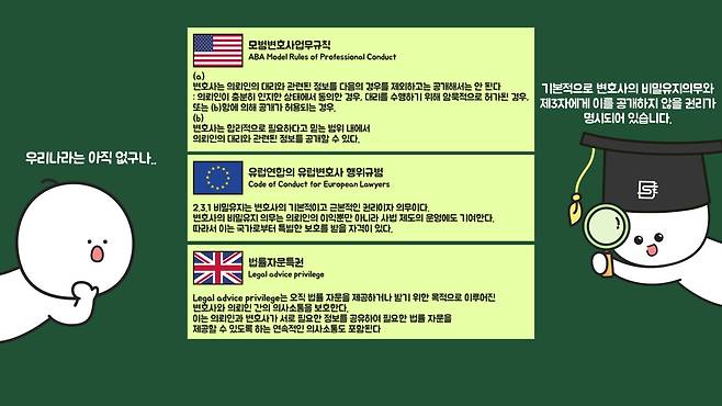 참고로 경제협력개발기구(OECD) 가입 국가과 비교했을 때 한국을 제외한 모든 국가에서 의뢰인의 비밀을 유지하는 것을 명확하게 권리로 규정하고 있습니다.
