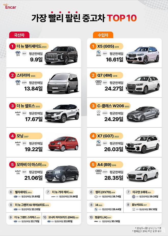 국산차의 경우 가장 빨리 판매된 상위 10개 모델 중에 비교적 최신 연식의 대형 SUV들이 상위권을 주로 차지했다. 2023년식 현대 더 뉴 팰리세이드가 9.9일(1위)로 가장 빠른 판매 기간을 기록했으며, 이어 2019년식 기아 모하비 더 마스터는 21.06일(5위)이었다. 이전 세대 모델인 2022년식 현대 팰리세이드도 21.93일(6위)로 판매 주기가 빠른 편이었다. 소형 SUV 시장에서 인기가 높은 기아 더 뉴 셀토스는 2022년식 모델이 17.67일(3위)로 대형 SUV 인기 속에서 존재감을 나타냈다.