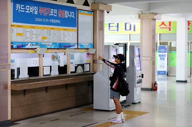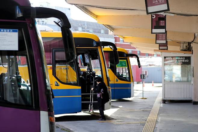 20일 오전 대전 중구 유천동 서남부터미널을 찾은 한 시민이 버스에 오르고 있다.