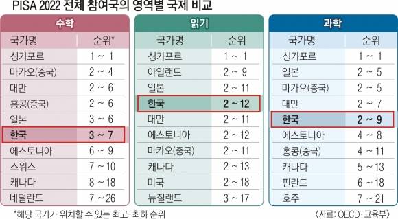 PISA 2022 결과에 따르면 OECD 회원국 37개국 가운데 한국은 수학 1~2위, 읽기 1~7위, 과학 2~5위로 최상위권에 올랐다.