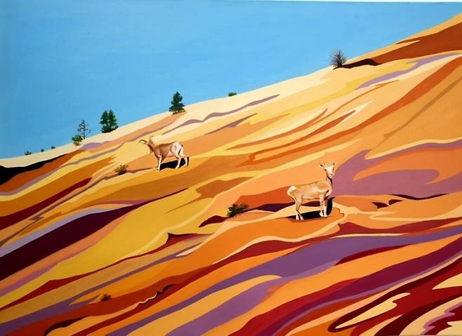 형형색색의 모래 바위, 작열하는 태양 아래 드리워진 거대한 사막의 모뉴먼트가 붉은 암반과 수풀 고원으로 둘러싸인 자이언 캐니언을 장혜진은 손의 에너지 속에서 소환된다. 벗겨낸 자연인 듯 보이지만 그 안에도 동물들이 살고 삶의 에너지가 자리한다.
