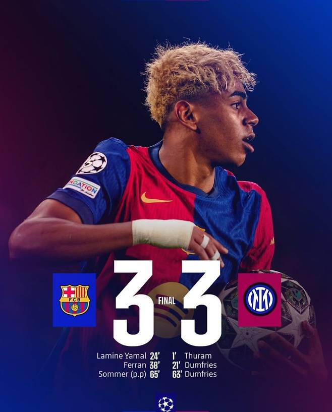 UEFA 챔피언스리그 4강 바르셀로나 인터밀란 경기 3:3 무승부..바르샤 라민 야말, 인테르 둠프리스 맹활약