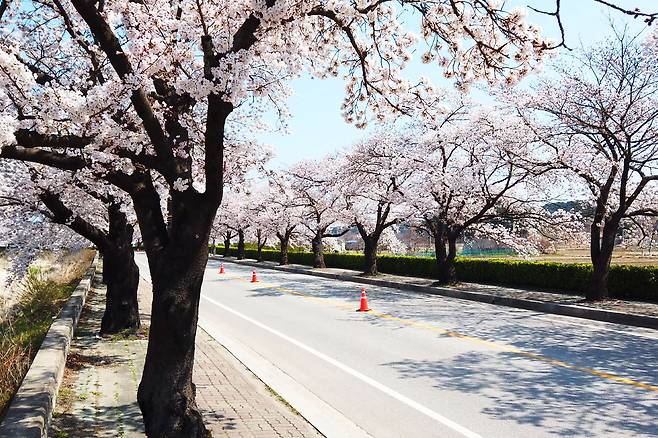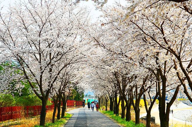 강변을 따라 조성된 산책길을 걷다 보면 흐드러지게 핀 벚꽃과 함께 잔잔한 물결이 어우러져 감성적인 분위기를 자아낸다.