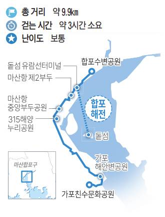 ◇평탄한 10㎞ 해안 길… 야경 즐기기도 안성맞춤= 이순신 장군의 두 번째 승전이자 왜군들에게 조선 수군의 기세를 알린 합포해전. 경남도는 합포해전지로 추정되는 진해 앞바다와 더불어 마산에도 승전길을 조성하고 있다. 합포해전 승전길 마산구간은 합포수변공원에서 시작해 김주열 열사 시신 인양지, 3·15해양누리공원, 가포해안변공원 등을 따라 마산 앞바다가 들여다보이는 해안 길로 이어진다.