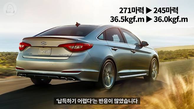 이밖에 개선형 엔진을 탑재했음에도 오히려 출력이 줄어들어 논란이 있었죠. 이에 대해 현대차는 과도한 스펙 경쟁에 목을 매는 것이 아닌 차량의 밸런스에 집중해 실용구간 토크를 강화하는 과정에서 줄어들었다는 해명을 했고 설명대로 전작 대비 뛰어난 밸런스 줄어든 출력을 체감하기 힘든 호쾌한 주행 성능을 제공했습니다만, 꽤나 큰 폭으로 줄었기 때문에 납득하기 어렵다는 반응이 많았습니다.