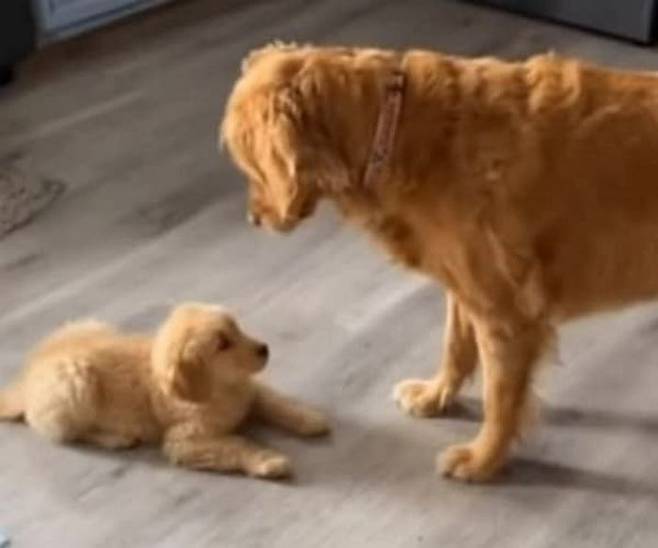 이날 골든 리트리버 강아지는 바닥에 앉아있는 새끼 강아지에게 다가갔다고 합니다. 그도 그럴 것이 위아래 서열을 확실하게 정리할 필요가 생겼기 때문인데요.