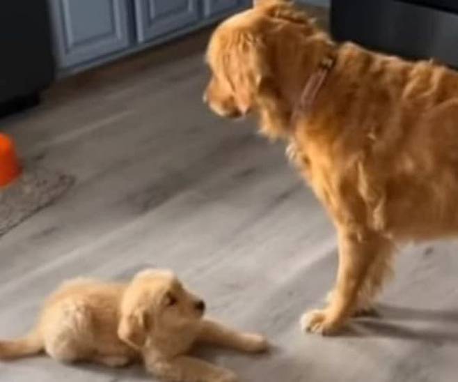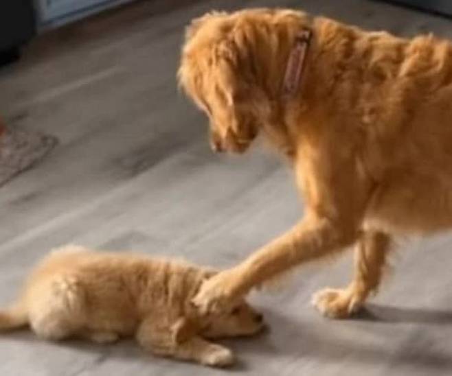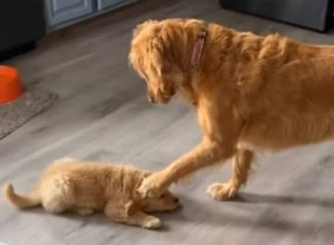 골든 리트리버 강아지는 새끼 강아지 앞으로 다가가서는 당연하다는 듯이 한쪽 앞발을 들어 올리며 새끼 강아지의 머리를 꾹 누르는 것 아니겠습니까.