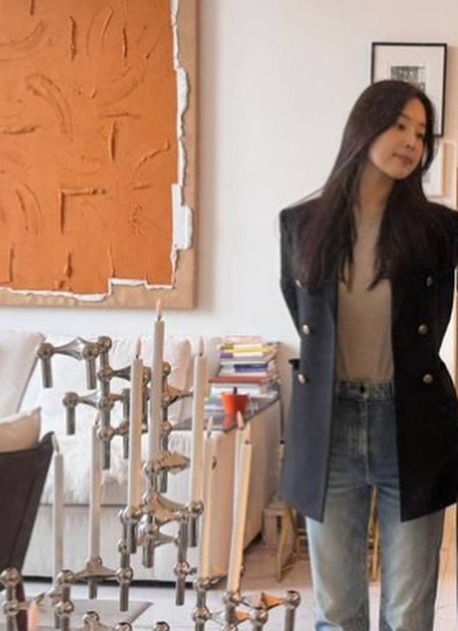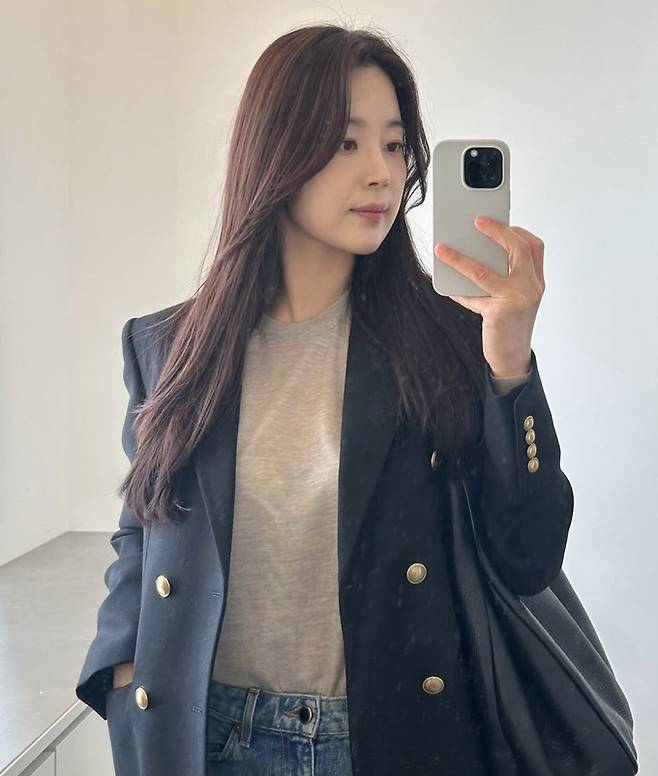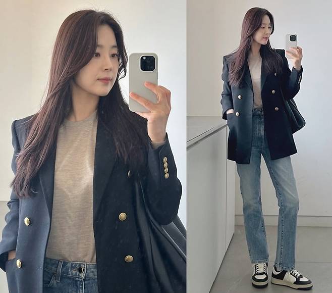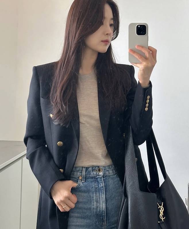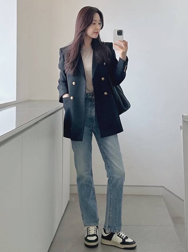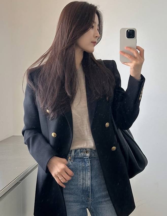 공개한 사진에서 한지혜는 데님 팬츠에 티셔츠를 입고 더블 버튼 재킷을 걸친 외출룩으로 시크하면서도 멋스러운 봄 패션을 선보였다.